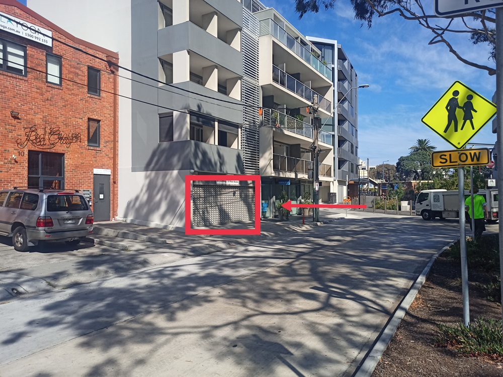 Disabled parking is available just inside the roller door shown in the image above. The disabled parking bay is just within the roller door area marked by the red rectangle, and the red arrow indicates the clinic entrance, which is adjacent.